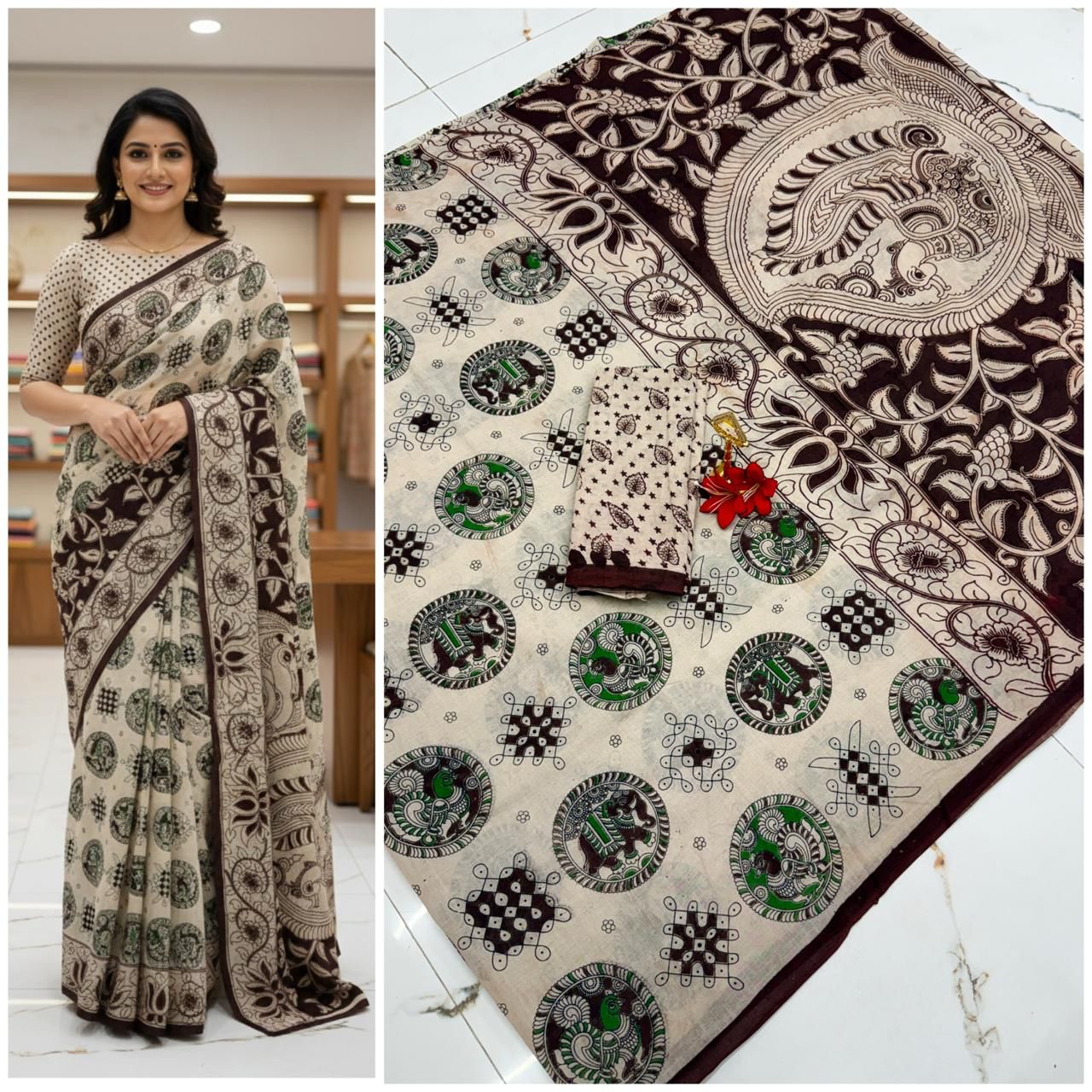 Whether you’re attending a festive gathering or a formal event, Pure Kalamkari Soft Cotton Sarees adapt to every mood. The intricate patterns and earthy tones fit seamlessly with any accessory, allowing you to express your individuality effortlessly while cherishing a piece of timeless artistry.